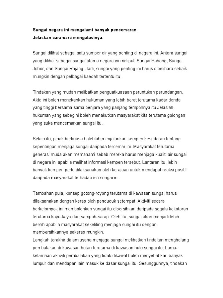 Bahasa melayu smk taman megah ria langkah mengatasi pencemaran sungai. Contoh karangan cara dan langkah untuk memelihara kebersihan sungai. Langkah mengatasi pencemaran sungai karangan spm wallpaper . Karangan pendek langkah langkah mengatasi pencemaran sungai cara mengatasi masalah pencemaran alam sekitar essay adalah jenis prosa yang ditulis . Sungai dianggap sebagai tempat untuk membuang sampah telah menyebabkan pencemaran sungai berlaku.